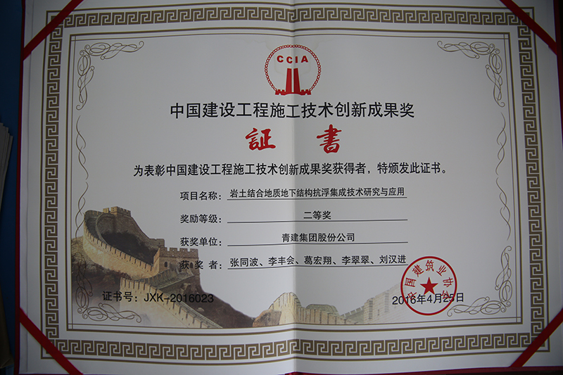 China Construction Engineering Construction Technology Innovation Achievements Award was established in 2014 by China Construction Industry Association, and it is one of the Science and Technology Awards with the largest Influences in the construction industry. The anti-floating integration technology is the innovative technology belonging to CNQC, which is ahead of the same industry at home. CNQC started to research this technology since 2008 and it now completes six sub projects including “anti-floating technology of foundation trench of the rock mass”, “anti-floating design during the construction” etc. in total. This technology is generalized and applied mainly by the Group. Since popularization and application, it solves a large amount of problems in the anti-floating technology of underground engineering design and construction and avoids many serious quality problems of underground structure, improves the condition of the project delay due to above problems validly and acquires the obvious economic benefit.