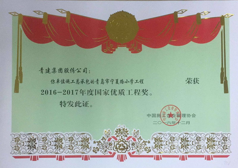 Qingdao Ningxia Road Primary School Construction project, located at No. 173 Ningxia Road, Shinan District, Qingdao, is one of the key projects of 2014 in Qingdao as well as the only elementary education school that has the three-star green building—— the standard determined by the Ministry of Housing and Urban-Rural Development of P.R.C. which has organized a few meetings to discuss the schemes and construction drawing design of the project. The construction of the project commenced from July 11, 2014, and was completed on May 16, 2015. It has got a few prizes including High Quality Structure Award in Qingdao, High Quality Structure Award for Construction Works in Shandong, Safe and Civil Construction Site in Qingdao, Safe and Civil Demonstration Construction Site in Shandong, Second Prize in National QC Activity, and one construction method of provincial level in Shandong. The project has received favorable response from all walks of society. The Energy Saving Department under Ministry of Housing and Urban-Rural Development has paid a few visits to it.