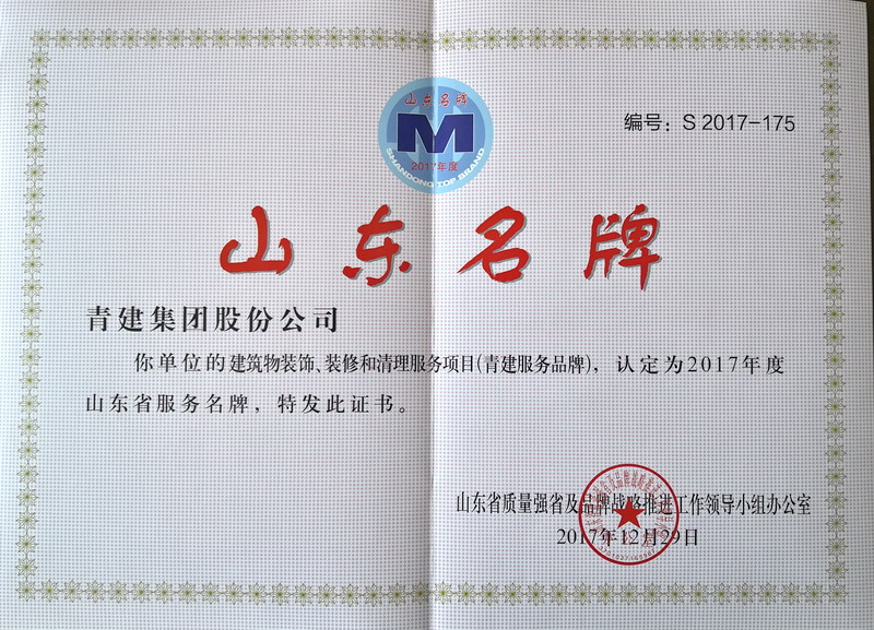 Recently, Announcement of the Leading Group Office of Shandong Provincial Quality Province and Brand Strategy Promotion Work Group on the Affirmation Result of Service Brand of Shandong Province in 2017 released 191 brands, such as “Qingjian” as “Service Brand of Shandong Province”.