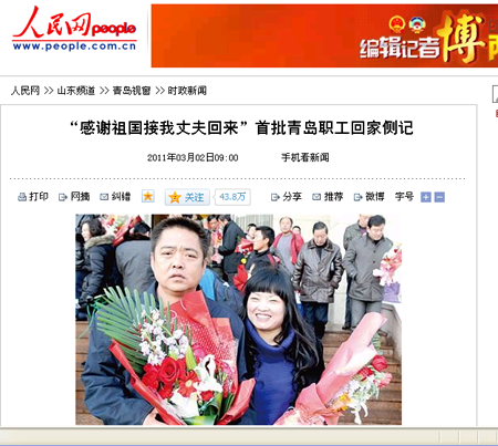 集團(tuán)利比亞分公司1293名員工在6天時間內(nèi)全部安全回國,媒體給予高度關(guān)注,據(jù)不完全統(tǒng)計(jì),共有新華網(wǎng)、人民網(wǎng)、新浪網(wǎng)、搜狐網(wǎng)、網(wǎng)易等網(wǎng)絡(luò)媒體以及青島日報(bào)、半島都市報(bào)、青島早報(bào)、青島財(cái)經(jīng)日報(bào)等平面媒體予以報(bào)道。3月2日,包括青島日報(bào)在內(nèi)的島城四家主要媒體均在頭版以較大篇幅報(bào)道,3月7日,青島日報(bào)第五版整版刊登長篇通訊予以詳細(xì)報(bào)道。以下是部分主要媒體的報(bào)道。